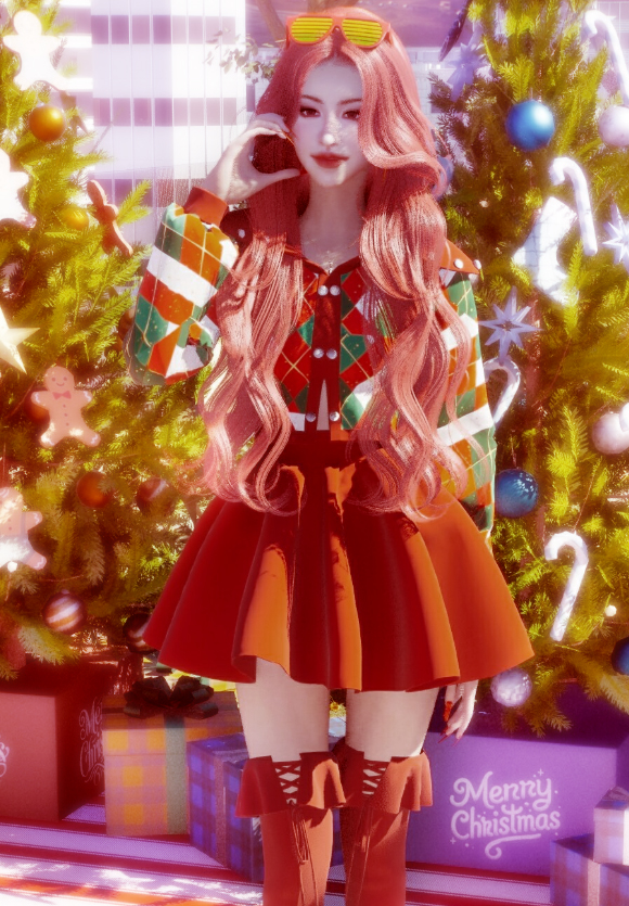 Flared skirt outfit with a Christmas pattern knit sweater for female zois.