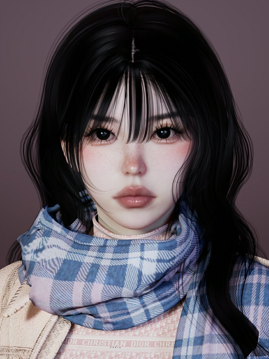 Beautiful female INZOI character that’s dressed for winter with a scarf and a cozy sweater. She has long hair with bangs and cute eyes.