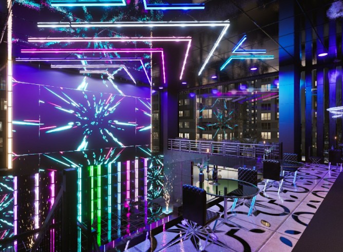 New inZOI lot type: night club. This is a modern and bright night club with neon lights above the dance floor and tables.