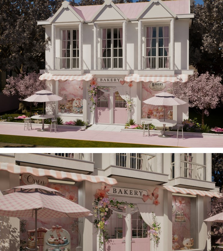 Check out this cute pink bakery shop build in Inzoi! Perfect for storytelling or just letting your zois chill in a beautiful lot.