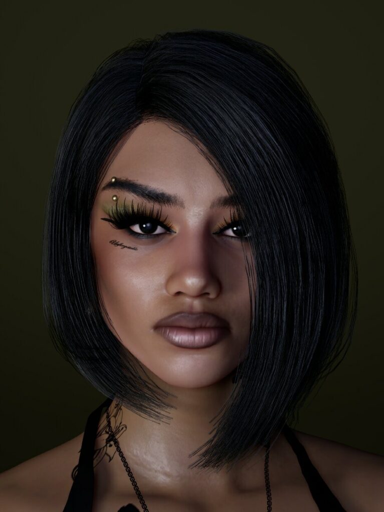 Stunning black female character with a Rihanna inspired side swept bob, piercings and face tattoos.