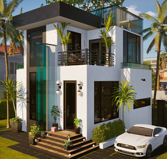 Mini luxurious home with an elevator, sports car, palm trees, and a balcony for living out your dream life.