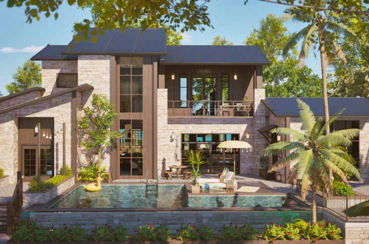 Stone & dark wood with a sea background. 4BR/3BA (2 Bedrooms downstairs / 2 ups.) family house with pool patio, farming area. A comfy coastal-mountain design with front and rear access to enjoy the natural Cahaya lifestyle.