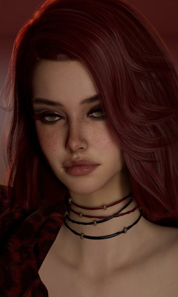 Redhead or brunette female zoi with a necklace and short hair.